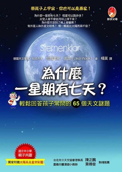 今年~西元2009年,為義大利著名的天文學家伽利略,從1609年首先將望遠鏡朝向天空,開啟了觀察宇宙、一窺星辰奧祕的四百週年,因此國際天文聯合會特別將今年定為「全球天文年」。衷心的希望這本《為什麼一星期有七天?》,能引領更多的小朋友熱愛天文、喜歡觀星,未來造就出更多台灣本土「下一代的伽利略」。大人小孩一起探討「宇宙如何誕生?」、「恒星如何演進?」、「太陽會不會爆炸?」、「地球有沒有末日?」、「什麼是黑洞?」、「真有外星人嗎?」。----台北市天文協會理事長/陳正鵬